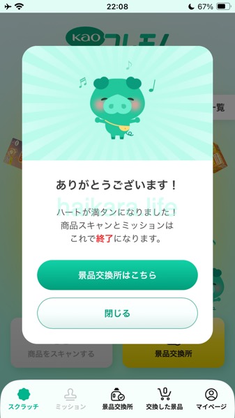 バーコードをスキャンすると「スクラッチくじ」が引けるんですが、必ずハートがもらえるわけじゃありません。