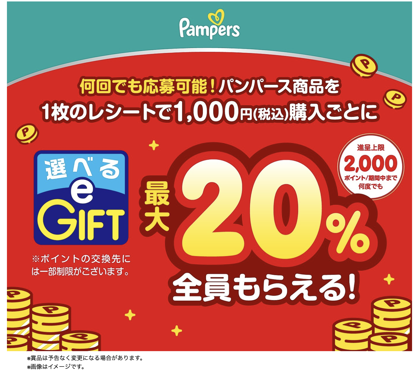 - 【2026年3月〜4月末まで】パンパース選べるeGIFTが最大20%全員もらえる!
